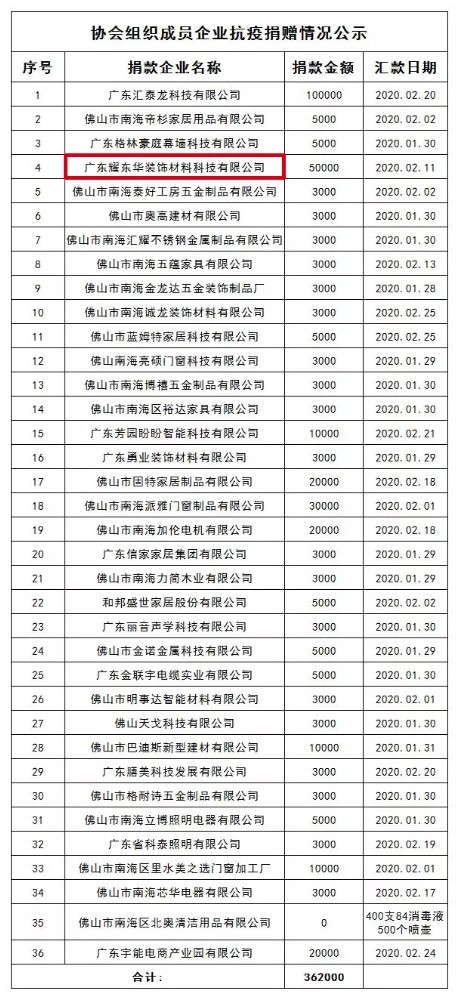 2020年2月26日,广东里水智能家居产业协会筹集了近千箱物资送达里水镇人民政府并举行捐赠仪式,由政府统一安排给抗疫前线。里水智能家居产业协会监事长、乐鱼线上平台(集团)官方网站公司董事长曾敏华出席了仪式。
