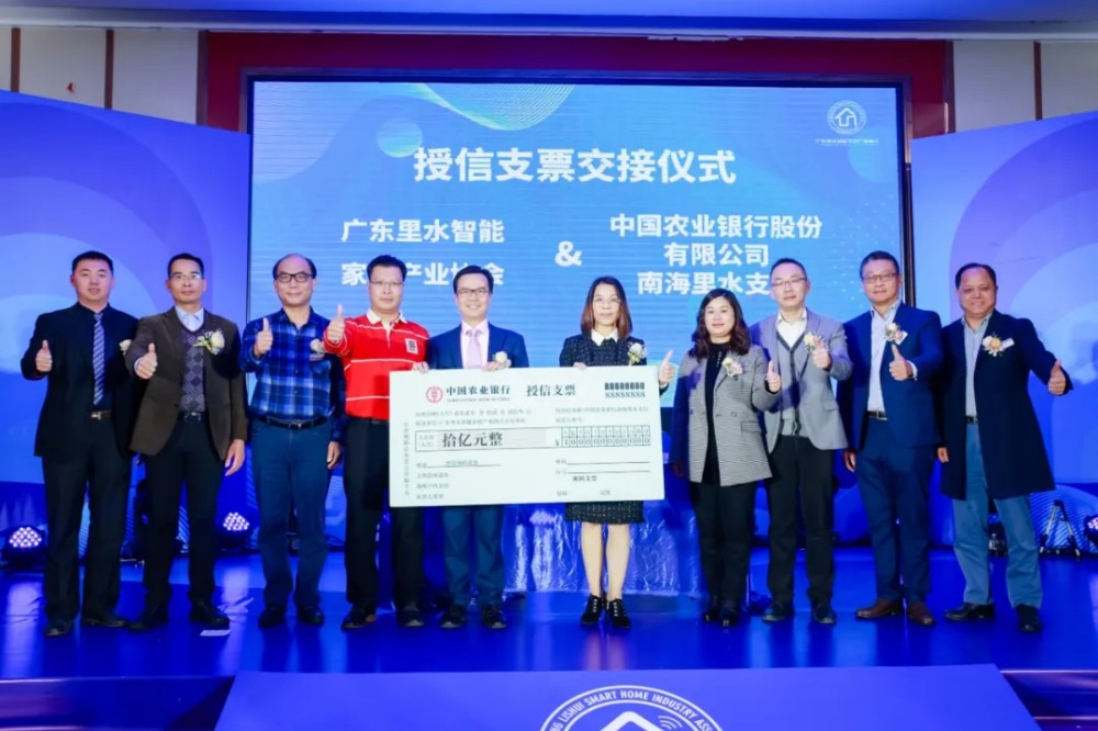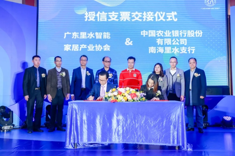 ↑里水智能家居产业协会与中国农行银行股份有限公司南海里水支行签订战略合作协议。
